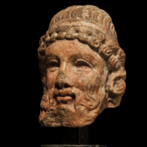 Dionysus, the god of wine, is portrayed frontal, looking forward. His hair is tied with a thick fillet with two rows of locks across his forehead. He has a long moustache and a square beard composed of curving locks. The face with arched eyebrows, large eyes sockets, pronounced cheeks, straight nose and a smiling mouth with fleshy lips. The Archaistic head is inspired by the Greek Archaic style, frontal and frozen, with stylized features and smiling mouth. It has a strong and majestic expression.
