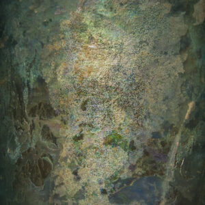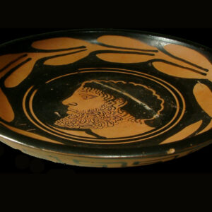 The tondo with “running dog” frame is set inside an almost square, red and green frame with an ornamental band composed of fishes and human heads. At its centre is a nude, wreathed figure with crotales, branches and wineskins.