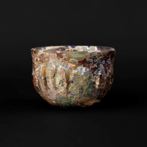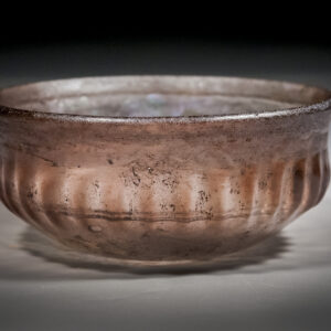 This elegant ribbed glass bowl exemplifies the artistry and technical skill of early Roman glassmakers. Crafted from a rare aubergine-hued soda‑lime glass, the bowl presents a gently flared rim and a rounded, harmonious profile with a lustrous, weathered surface that reveals a rich, multicolored iridescence developed through centuries of natural burial conditions. Measuring approximately [dimensions available on request], it is a compact yet striking domestic vessel.