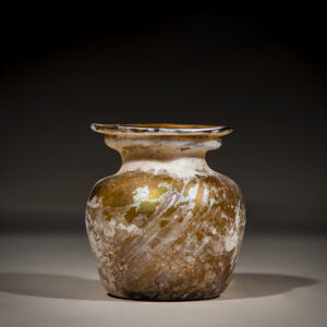 The craftsmen of Ancient Rome were constantly innovating to perfect their methods, while reaching new heights of early artistry. The swooping ribbons on the body of the amber glass jar may seem like a simple stylized effect, yet it represent the fine work of a dedicated glassblower using the most rudimentary of tools to create a truly unique piece of filled with ancient beauty.