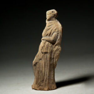 This terracotta piece shows a monster seated on its haunches and in profile, with its head turned to the right toward the public. The female countenance has idealised features of great beauty. The thick, wavy hair is crowned with a polos or crown on the Corinthian model. On the right wing the rendering of the feathers shows a clear interest in the anatomical details of birds: the feathers inserted into the body itself are small and short, rather like scales, while those at the extreme end of the wing are long and narrow, to help the bird take flight.