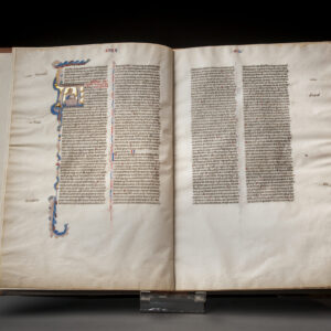Coming from Italy in the 2nd half of the 14th century CE, this book measures 320 x 227 mm and includes 10 leaves. Each leaf/page has two columns of 48 lines written in black ink in a round gothic bookhand between four verticals and 49 horizontals ruled in plummet. There are rubrics of red, letters of running headings and chapter numbers alternately red and blue, initials of red or blue with cusps and flourishing of both colors extending beyond the height of the text to open each chapter.