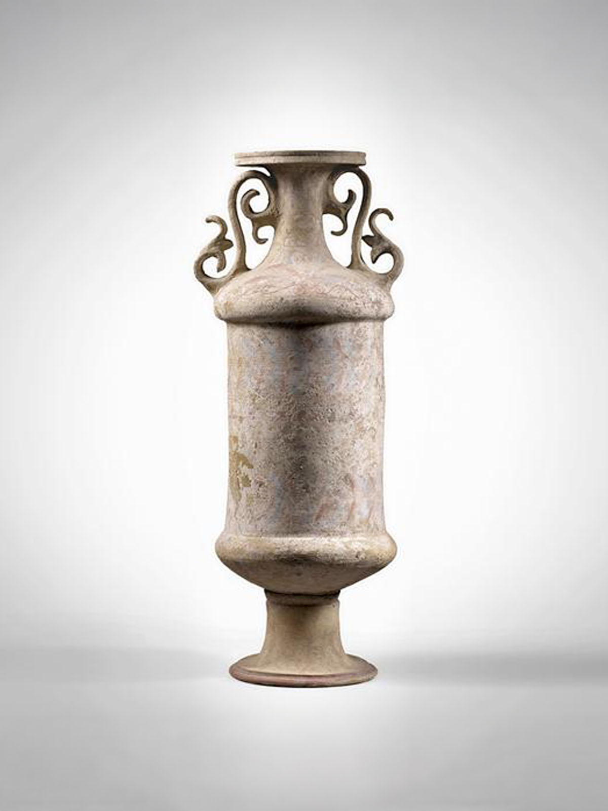 White slip Greek amphora with volute handles and stylized cylindrical body. Elongated and flared base tapers up towards vessel’s chamber. Mouth rises from narrow neck to a flared mouth.