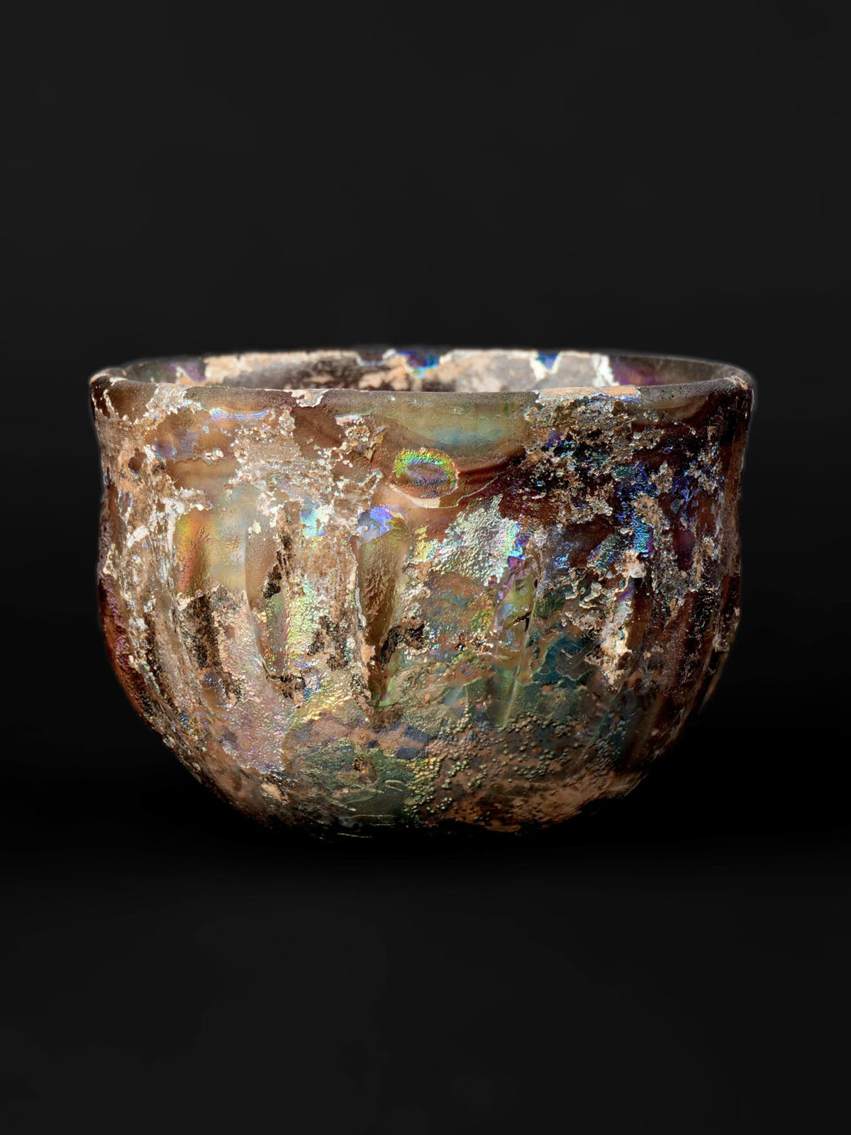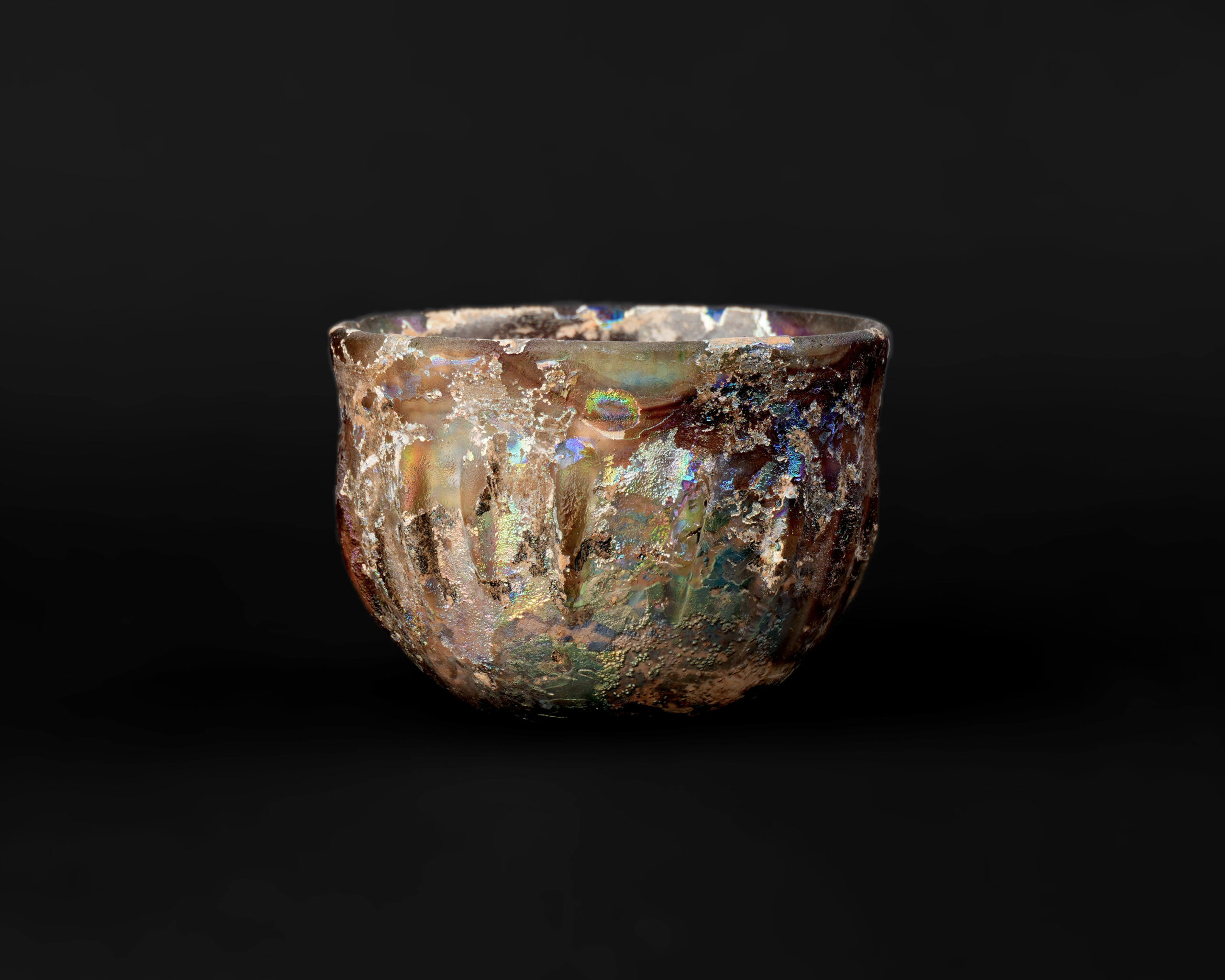 This elegant ribbed glass bowl exemplifies the artistry and technical skill of early Roman glassmakers. Crafted from a rare aubergine-hued soda‑lime glass, the bowl presents a gently flared rim and a rounded, harmonious profile with a lustrous, weathered surface that reveals a rich, multicolored iridescence developed through centuries of natural burial conditions. Measuring approximately [dimensions available on request], it is a compact yet striking domestic vessel.