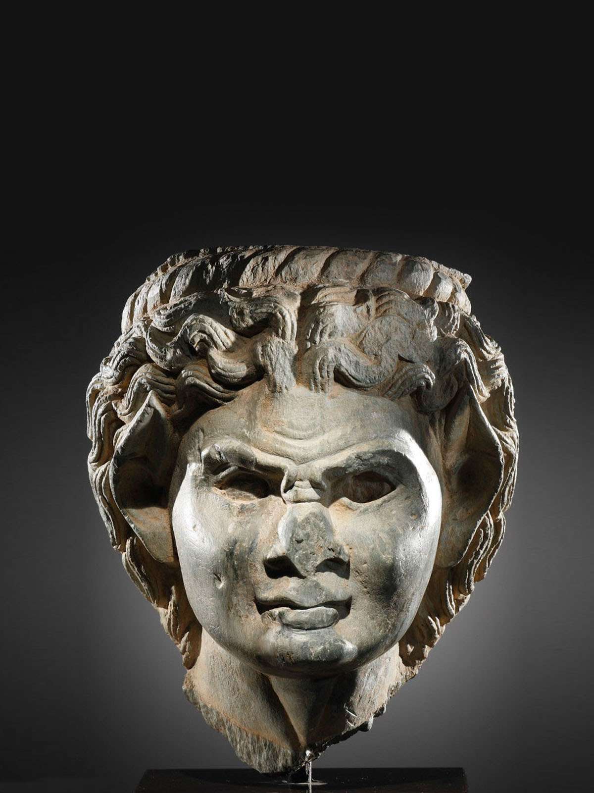The round face is dominated by deep holes for eyes which were originally inlaid. The root of the nose is strongly furrowed, as too is the forehead above, its series of wavy grooves mirroring the curvature of the expressive high-arched brows. Prominent cheekbones, with fleshy, rounded cheeks below; under the broad nose, full sensuous lips with dimples. To either side of the face, long, pointed ears with deep auricles. A exuberant shock of curling locks, whose individual strands are articulated with incised lines, is parted in the middle to form an anastole and spreads outwards in three luxuriant strands to frame the face.