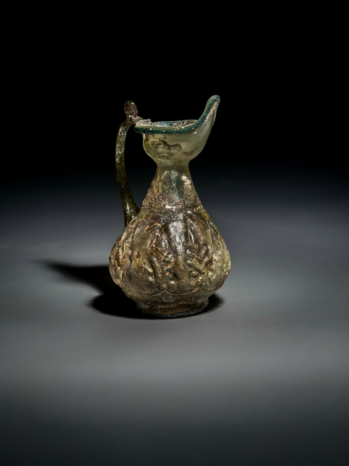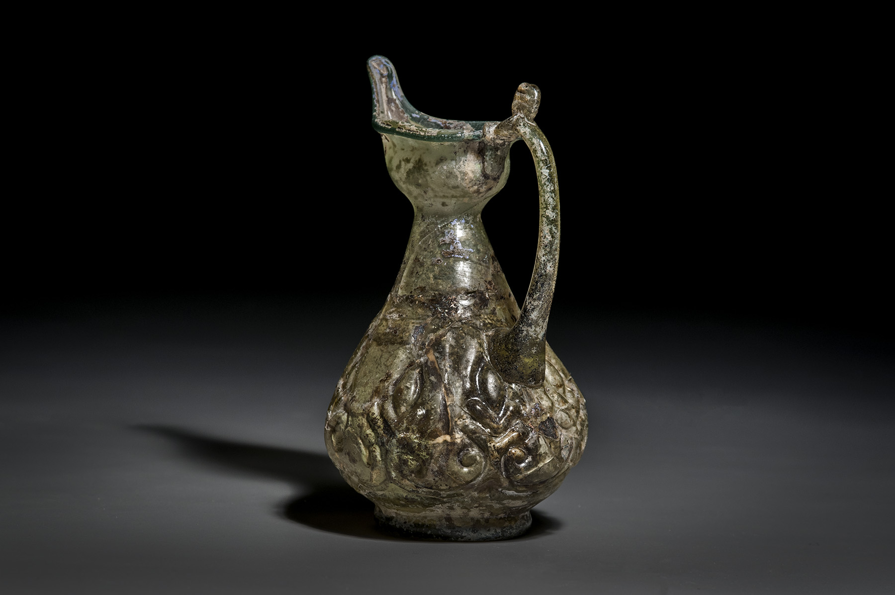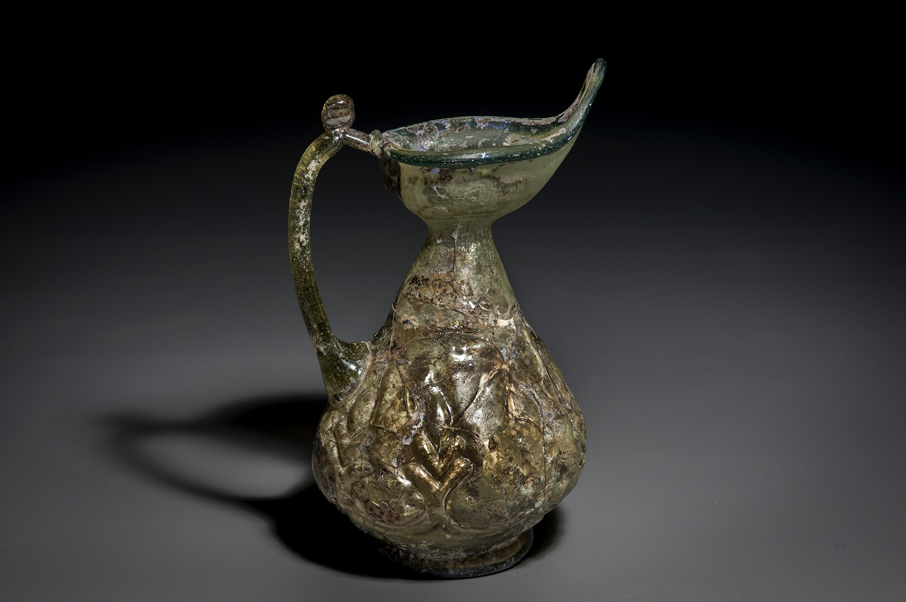 An elegant Islamic glass bottle with a pointy rim, a single handle, and decorated with a leaf motif around the body