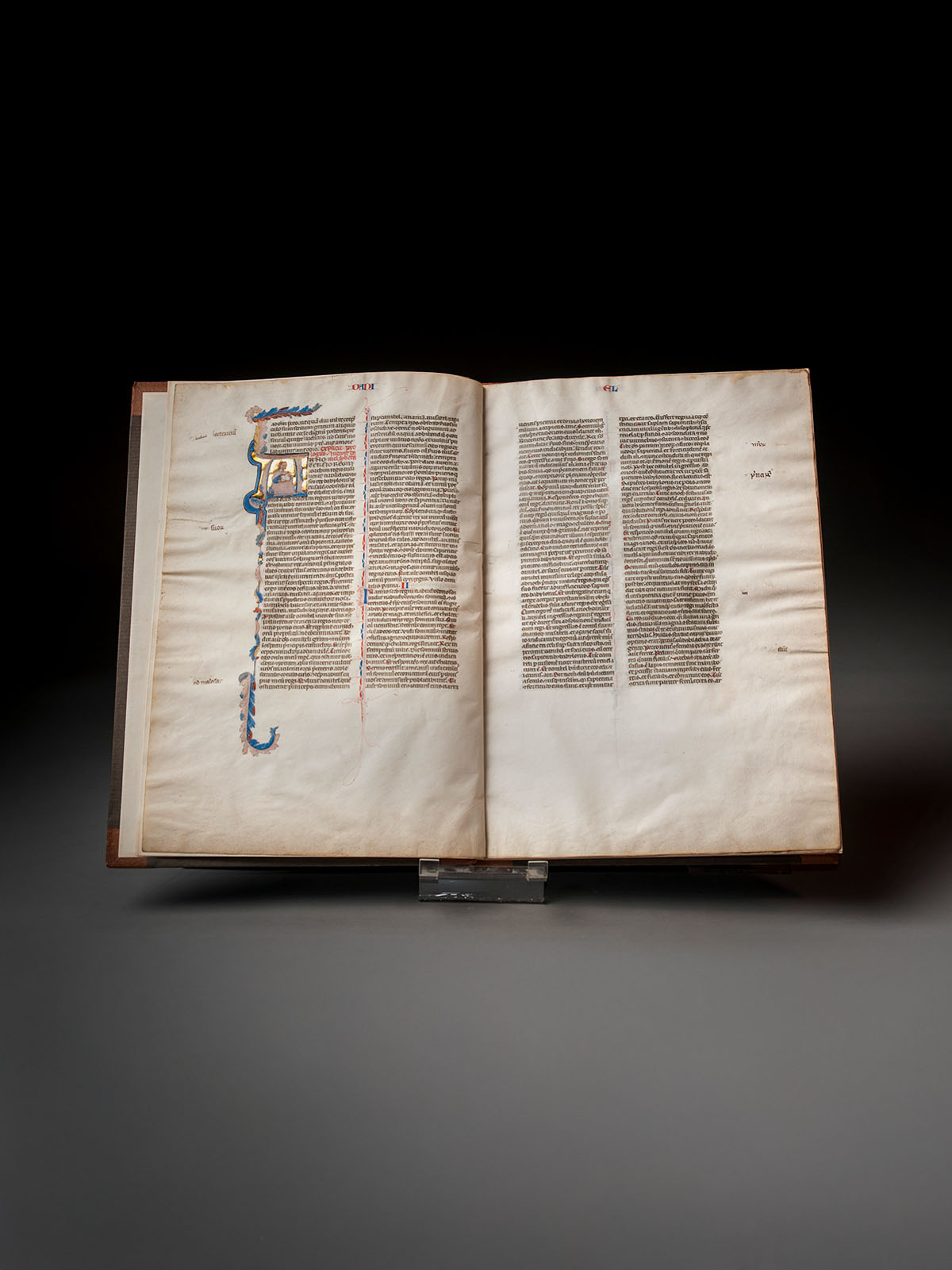 10 leaves, two columns of 48 lines written in black ink in a round gothic bookhand between four verticals and 49 horizontals ruled in plummet, rubrics of red, letters of running headings and chapter numbers alternately red and blue, initials of red or blue with cusps and flourishing of both colours extending beyond the height of the text to open each chapter, TWO ILLUMINATED FOLIATE INITIALS and HISTORIATED INITIAL WITH TEXT-HEIGHT ACANTHUS BORDER, in pastel colours and burnished gold (tiny area of dampstaining at top of margin of first three folios). 20th-century half pigskin (slightly rubbed at extremities).