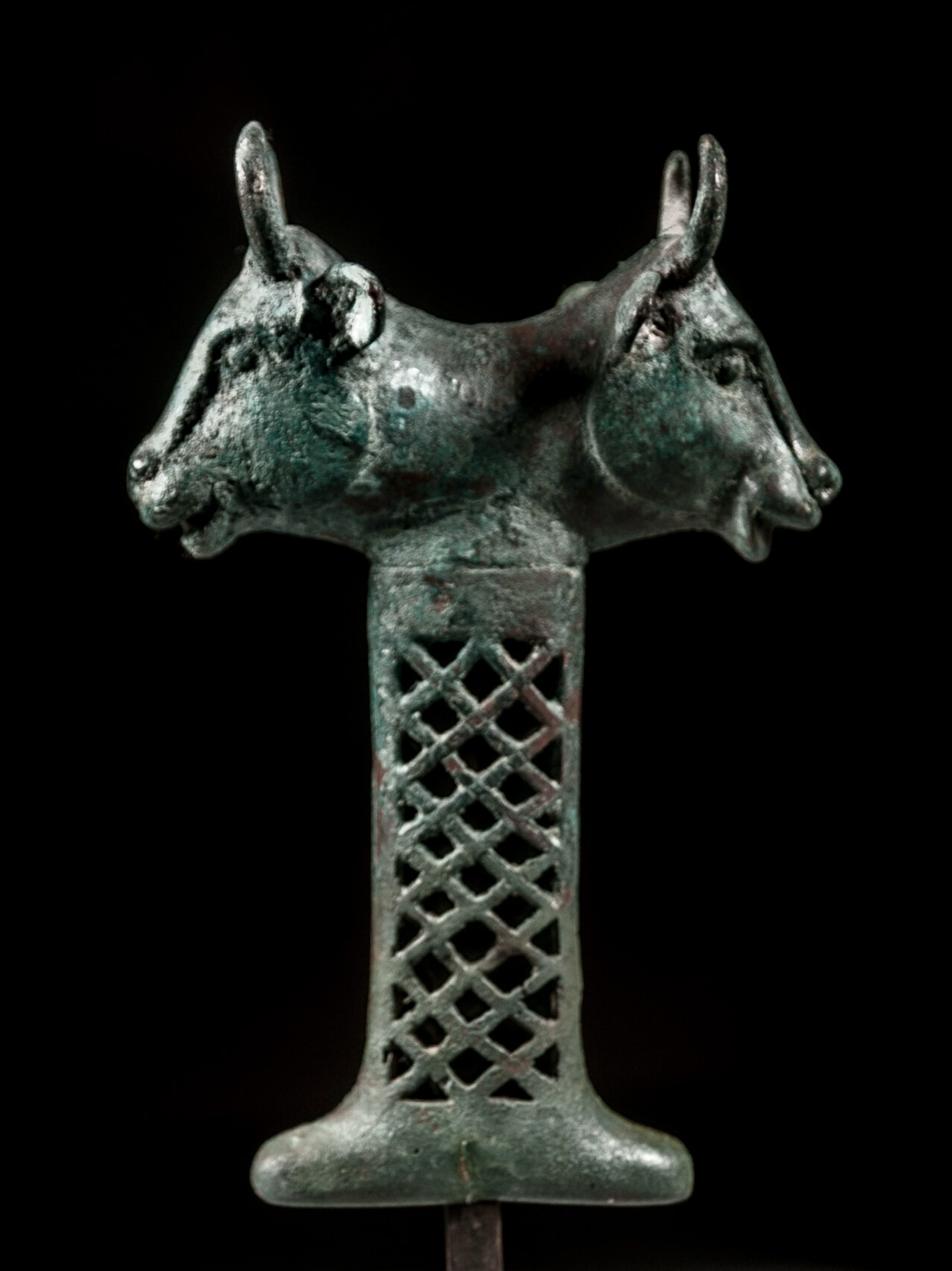 In the ancient Elamite kingdom, bulls were potent symbols of strength, fertility, and divine power, often associated with deities and rulers. This double-headed bull mace head likely held ceremonial or ritual significance, symbolizing authority, protection, or a connection to the divine. Its exquisite craftsmanship speaks to the advanced skills of the ancient Near Eastern metalworkers and their ability to imbue objects with profound cultural meaning.[/vc_column_text]