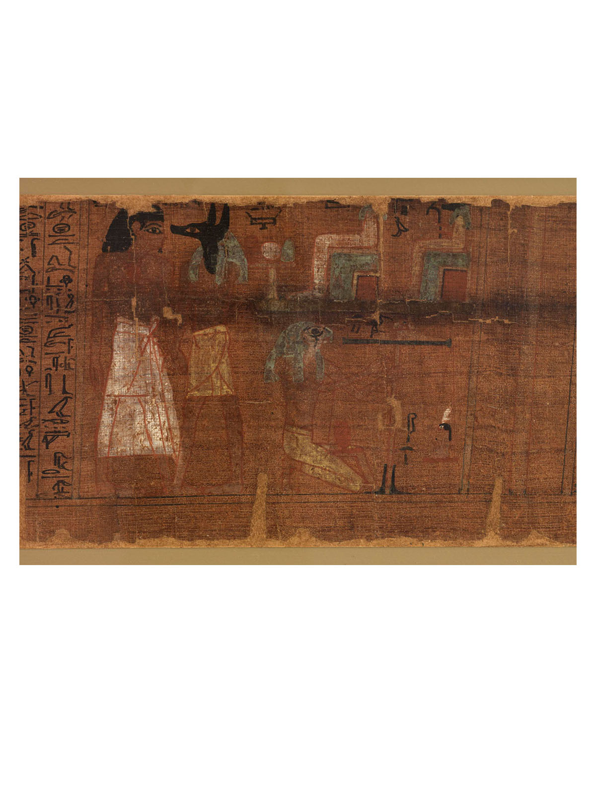The longer sheet carries thirty columns of Chapter 125 ‘The Declaration of Innocence’ with a scene showing standing figures of Anubis with the dead man to the left of a kneeling falcon headed god (Horus though he is labelled Thoth) supervising the weighing of the heart against Maat. Two seated gods above the scales represent the 42 gods who witness the judgement. Two of the three columns in the center are from Chapter 81a ‘Spell for becoming a lotus’ and on the right side of the sheet are ten columns from the beginning of Chapter 144 ‘Address to the Keepers of the Underworld’ with the paired figures of the horned guardian and reporter of each gate shown at the foot of the column.
