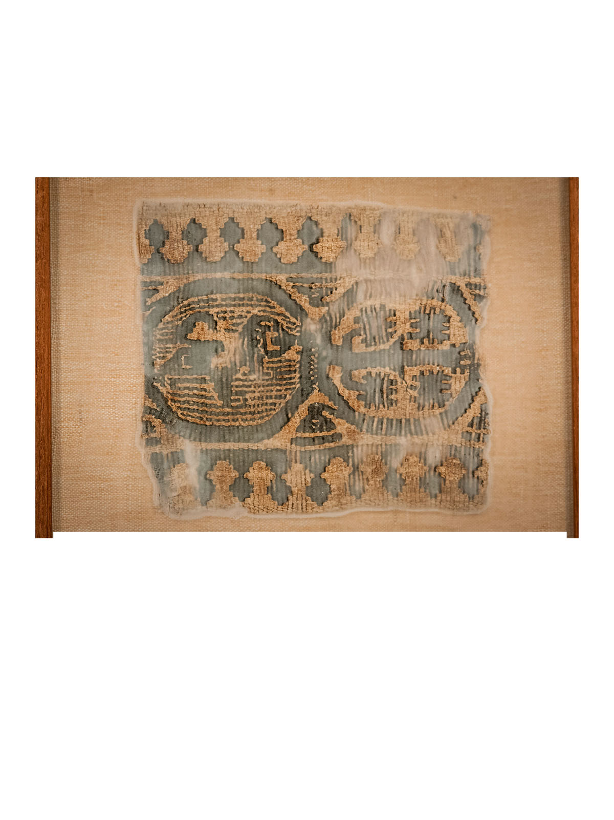 Mounted on beige linen ground and framed. Fragments of tunics, tabulae, etc. – Cf. Cat. Leipzig – 2002, 113 ff. nos. 157–173 with ill.