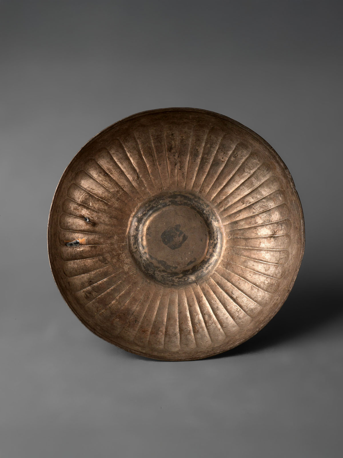 Gilded silver Phiale wine ribbed bowl from the Greco-Achaemenid period, circa 500–300 BC. This luxurious vessel measures approximately 18 cm in diameter and exemplifies the opulence of fine Greek and Persian craftsmanship during this era. The bowl features a shallow, broad form with a gently flared rim, designed both for aesthetic appeal and practical use.