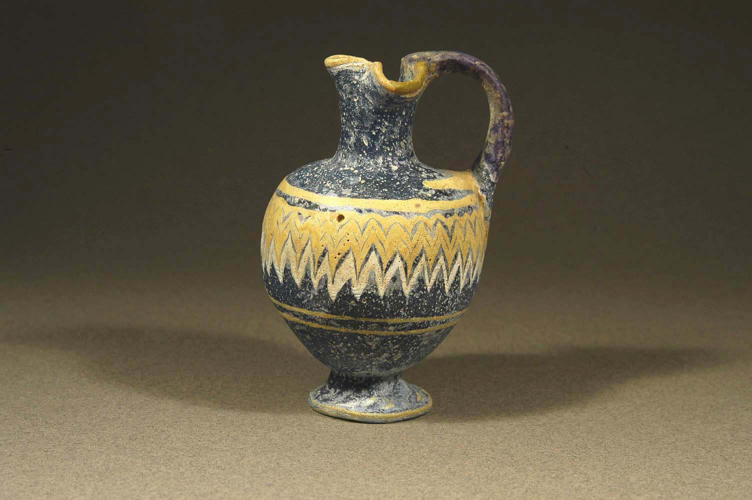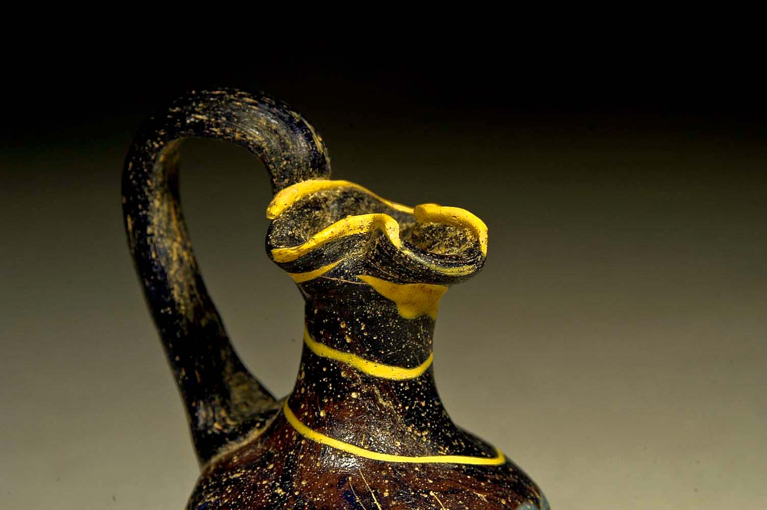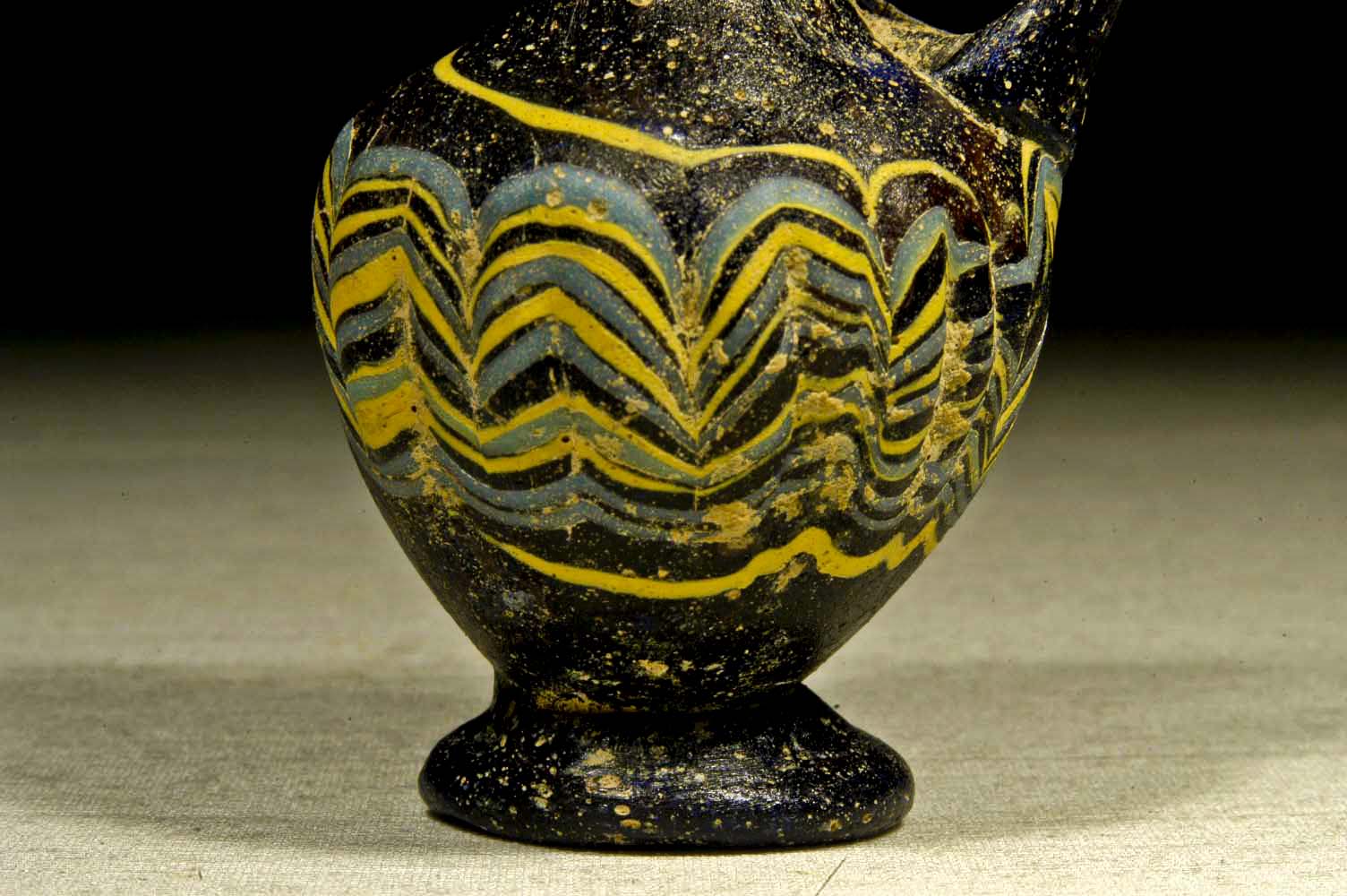 A beautiful aubergine Greek two tone core formed glass Oinochoai with opaque blue and opaque yellow decoration. A trefoil mouth with a single handle.