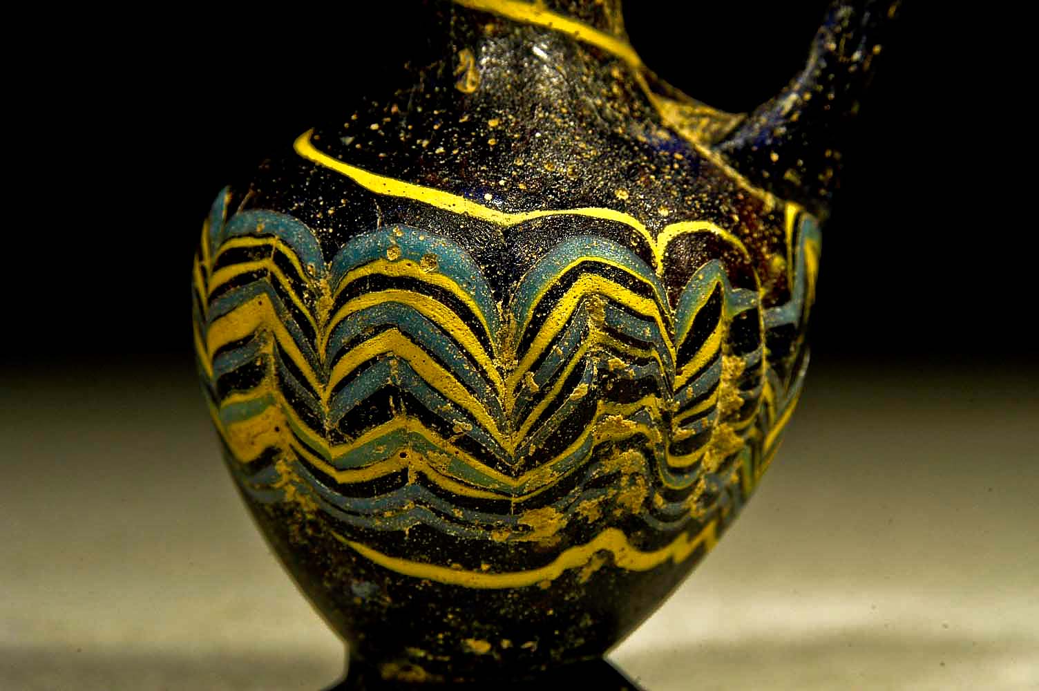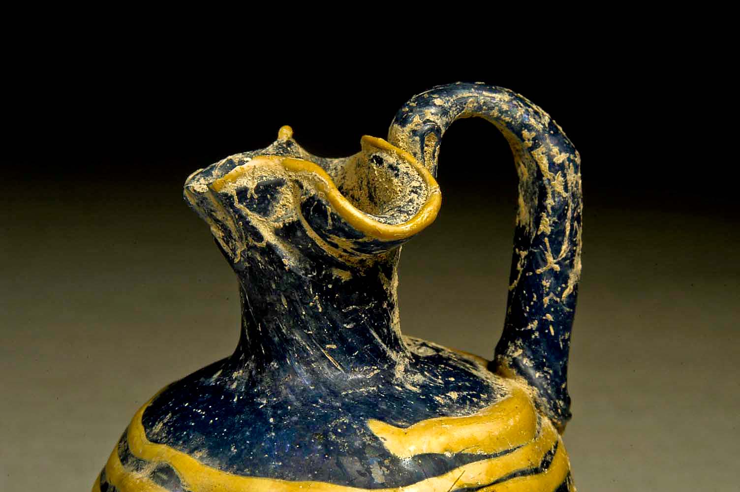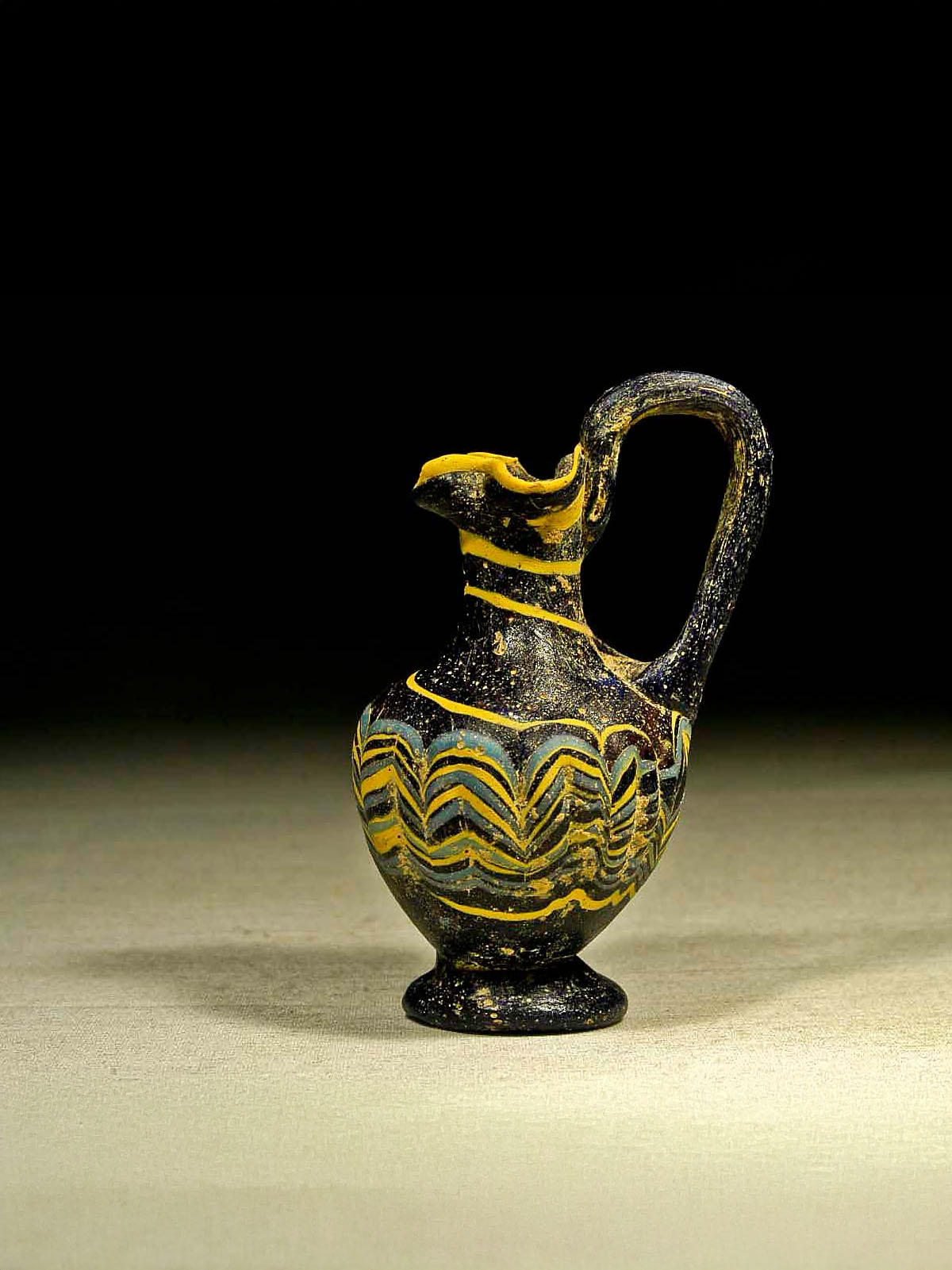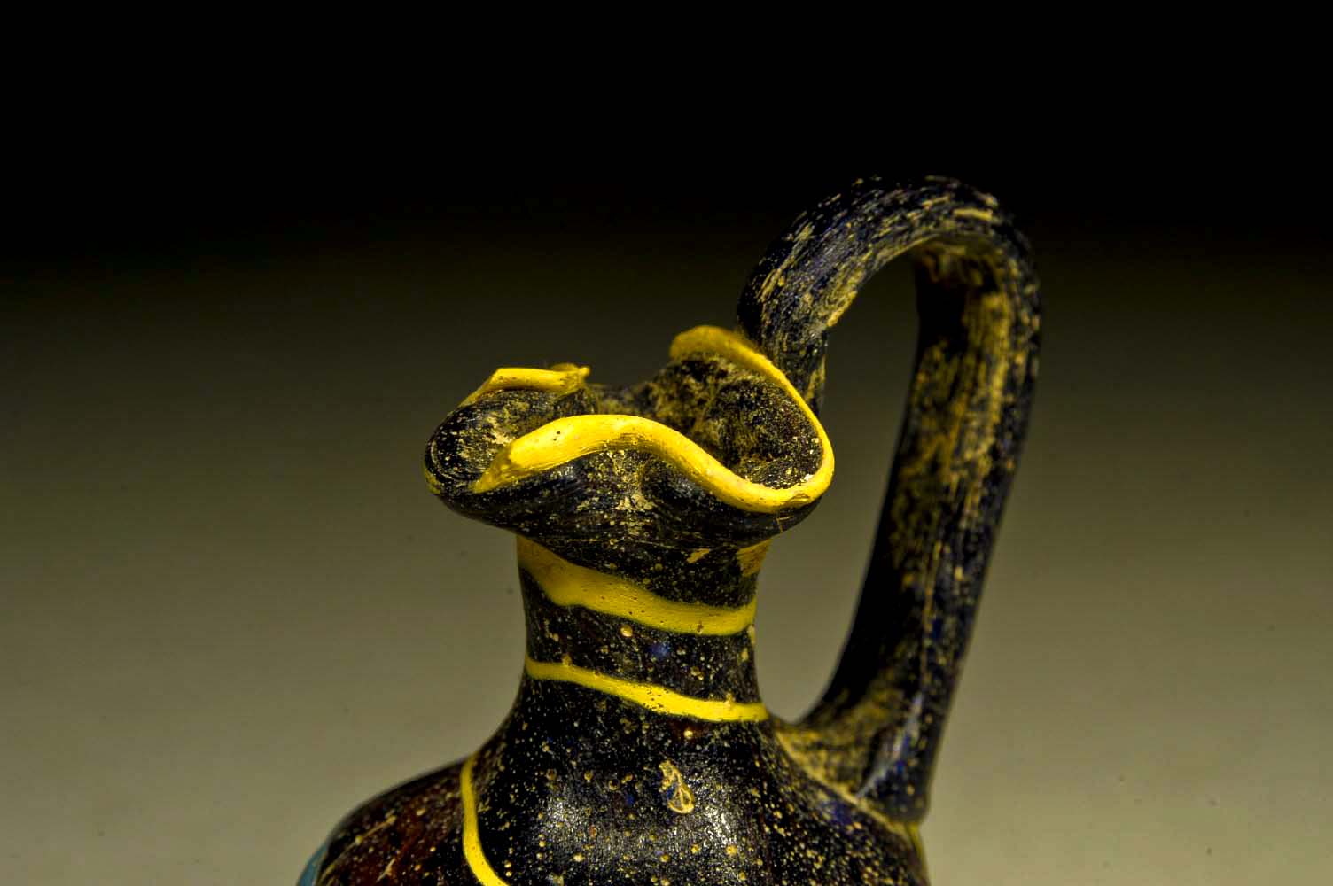 A beautiful aubergine Greek two tone core formed glass Oinochoai with opaque blue and opaque yellow decoration. A trefoil mouth with a single handle.