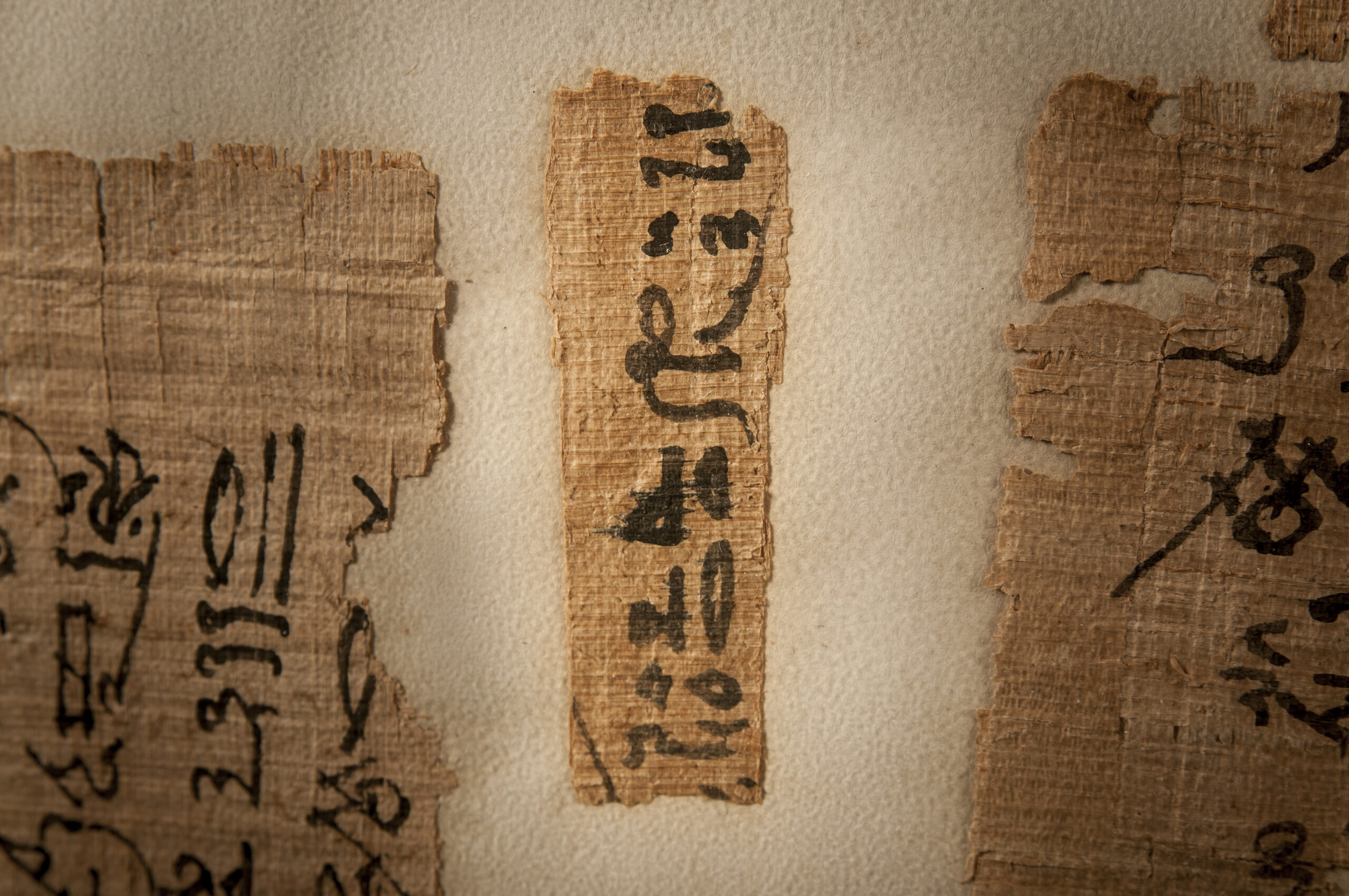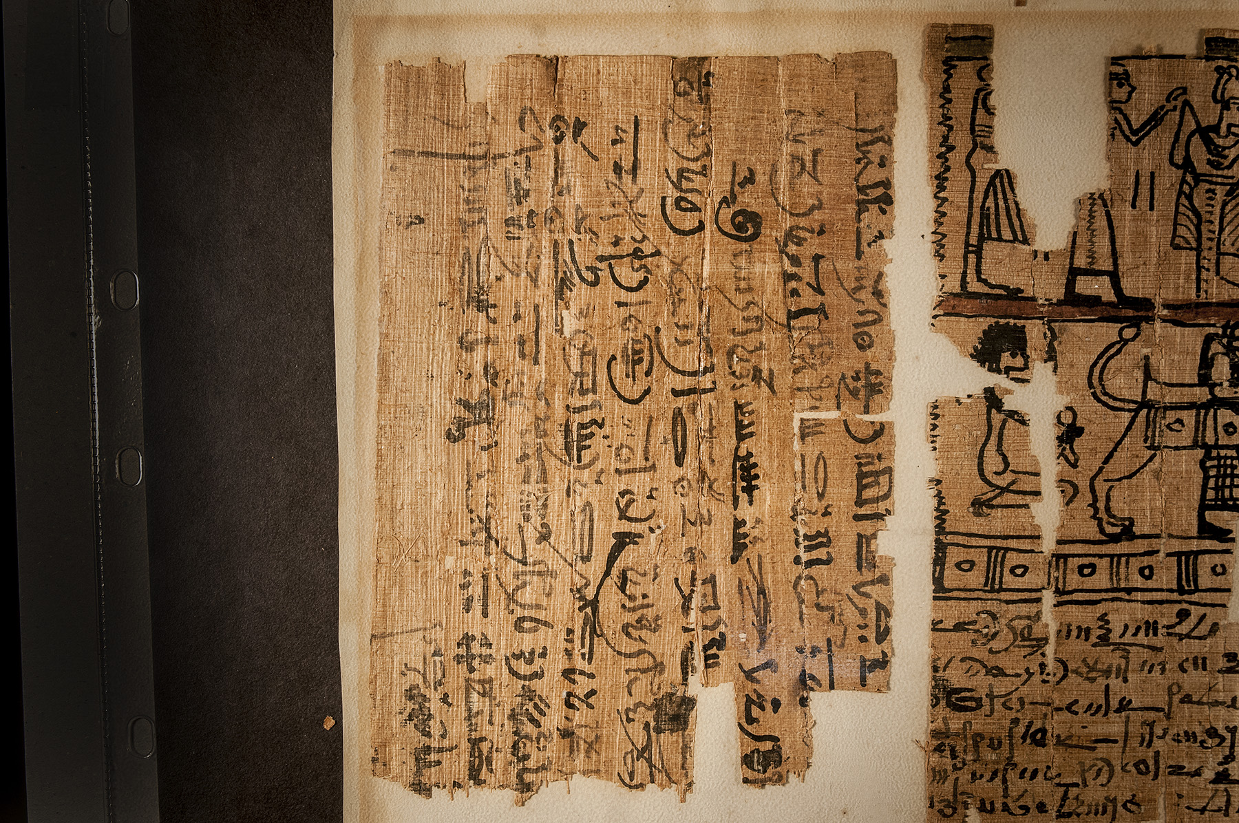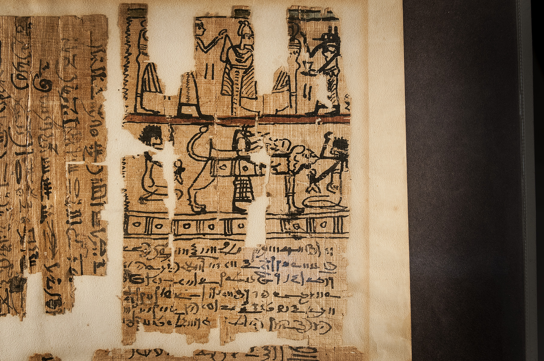 Featured here are several papyrus fragments of the Egyptian Book of the Dead from Egypt’s Ptolemaic Era (305 – 30 BCE). Examining Egyptian art during these 300 years reveals strong continuities in its traditions but also interactions with Greek art, whose forms and styles swept the world with Alexander’s armies. The encounter of the two cultures had many aspects and phases, and is easiest to comprehend by looking first at the new ruling class, its involvements and concerns, and then at religion and the arts in the greater land of Egypt.