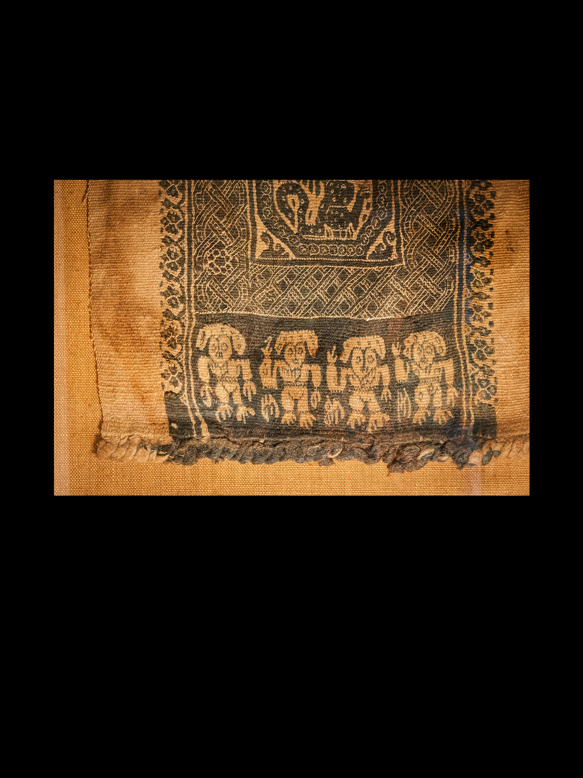 Important Woven Cloth with Lion Frieze and Ornamental Bands. Two-coloured tapestry weave in silhouette style, fine-threaded, dark grey and beige.